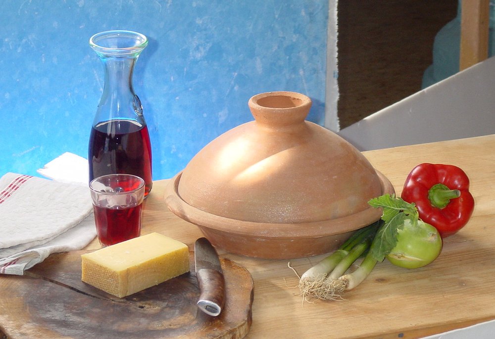 Die Tajine ist sowohl der Name des konischen Lehmtopfes als auch des darin geschmorten Gerichts aus dem Maghreb. Diese Zubereitungsart stammt ursprünglich aus der Berberküche und ermöglicht durch die spezielle Form eine besonders schonende Hitzeverteilung, bei der das Fleisch im eigenen Saft gart.