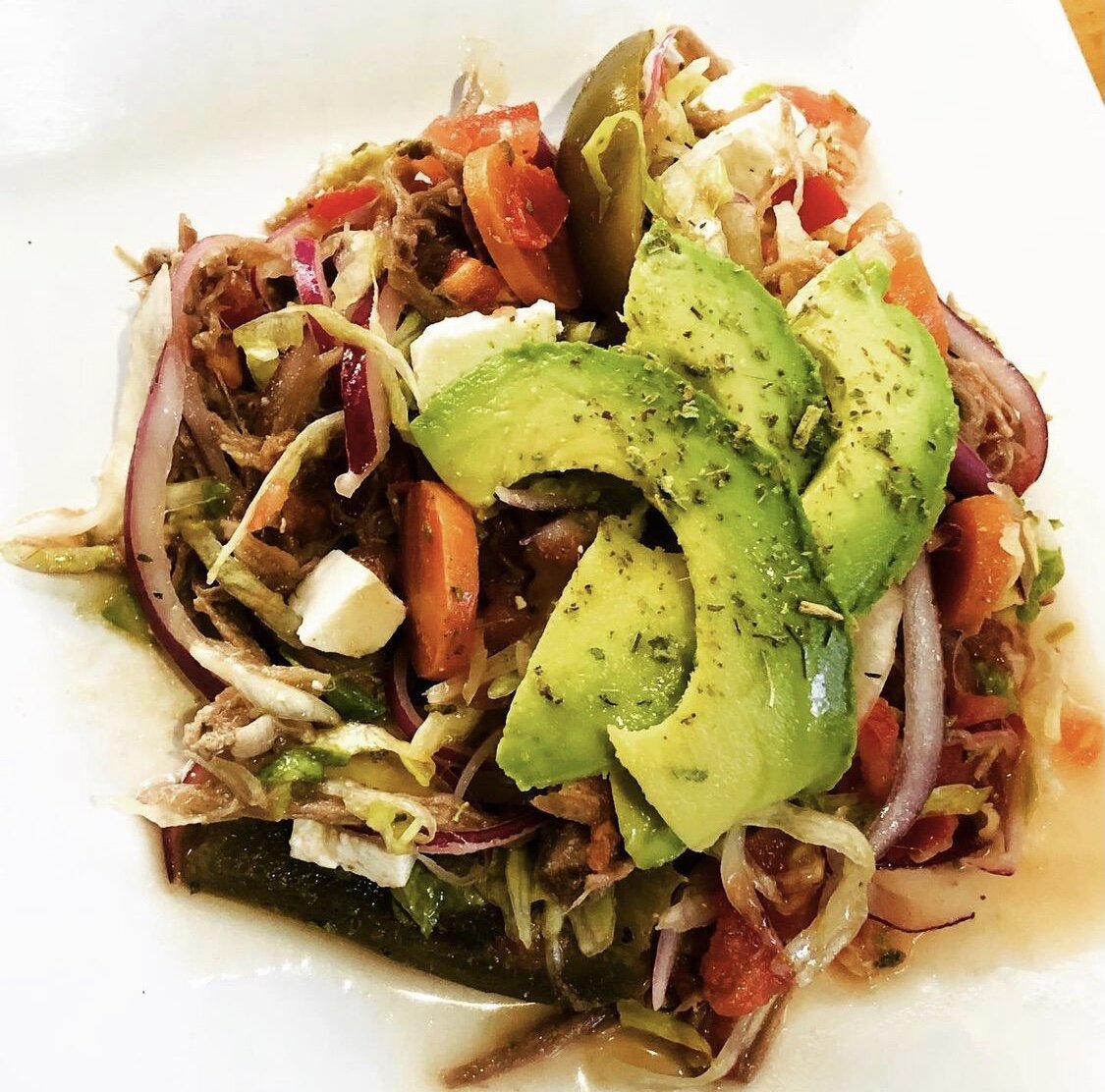 Ein frischer, herzhafter mexikanischer Rindfleischsalat, bei dem zartes, zerzupftes Fleisch auf knackiges Gemüse und eine würzige Vinaigrette trifft. Traditionell wird dieser Klassiker auf knusprigen Tostadas serviert und mit Avocado sowie cremigem Käse verfeinert – perfekt als leichtes Mittagessen oder Abendbrot an warmen Tagen.