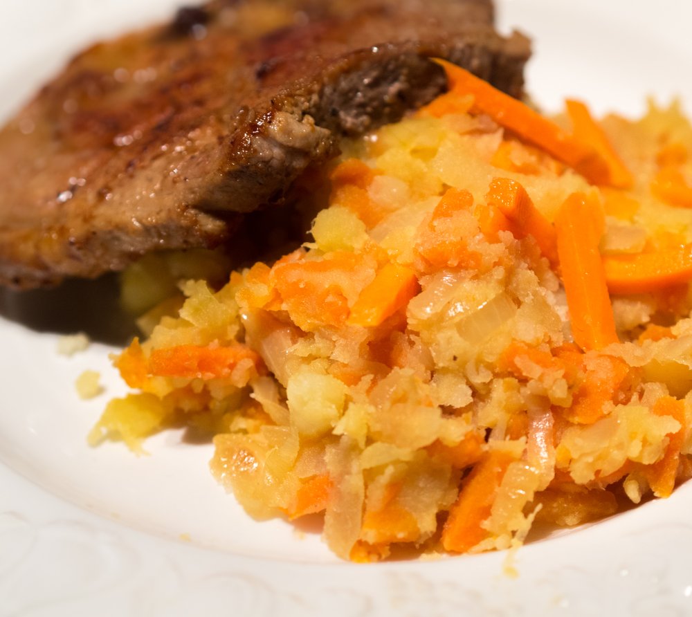 Ein herzhafter niederländischer Stamppot aus gestampften Kartoffeln, Möhren und Zwiebeln. Traditionell wird dieses Wintergericht mit Rauchwurst oder geschmorter Rinderbrust serviert.
