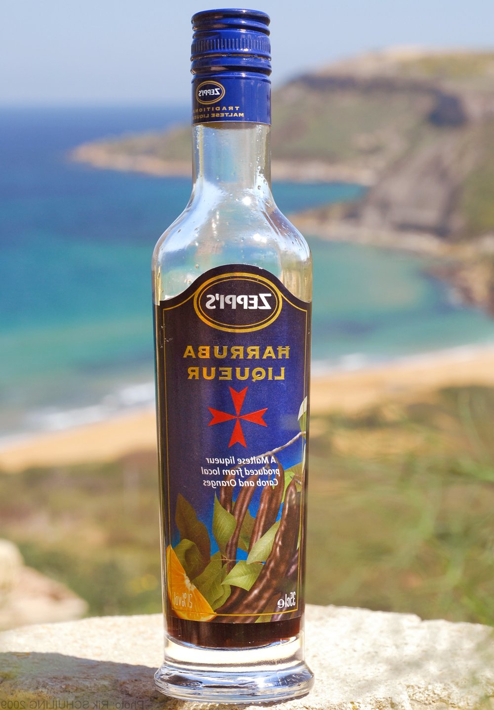 A bottle of Maltese carob liqueur with the north coast of Gozo Island in the background (Malta, April 2009) – Foto: RikSchuiling / TropCrop - TCS (CC BY-SA 3.0)