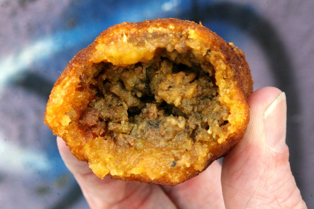 Knusprige, frittierte Fritters aus grüner Banane und Yautía mit würzigem Hackfleisch-Füllung – ein beliebter Snack aus Puerto Rico, der an Kibbeh erinnert und mit Annatto-Lard farbig und aromatisch gewürzt wird.