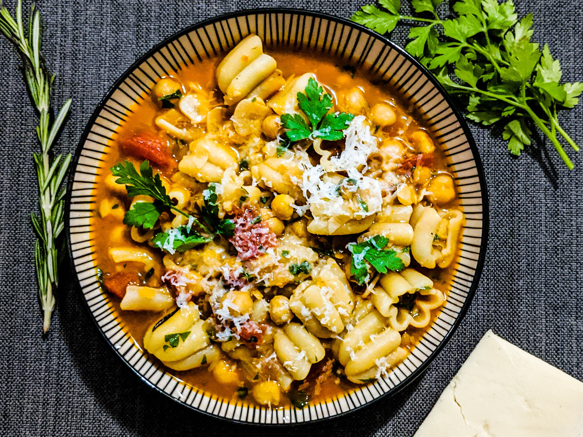 Ein cremiger, wärmender Klassiker der 'Cucina Povera' aus Rom. In diesem traditionellen Eintopf gart die Pasta direkt im Sud der Kichererbsen, wodurch eine unvergleichlich sämige Bindung entsteht. Ein einfaches, aber tief befriedigendes Gericht mit dem Duft von Rosmarin und Knoblauch.