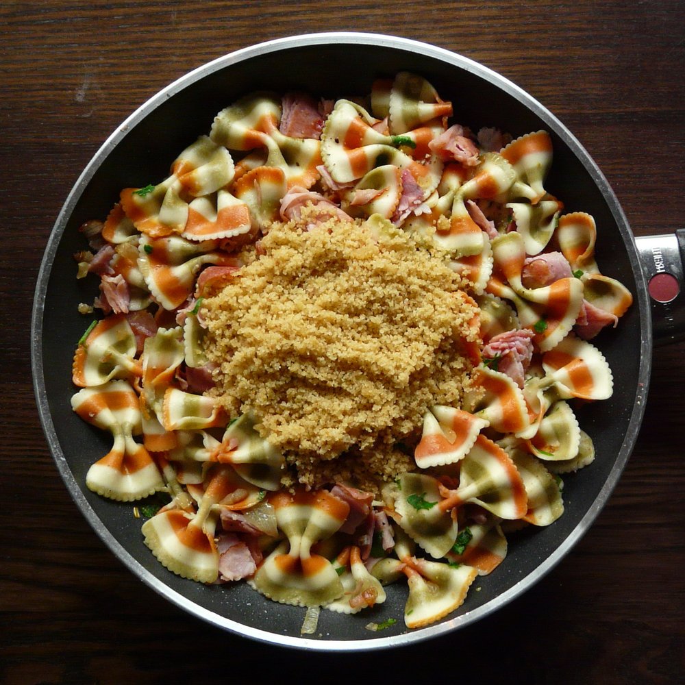 Ein schnelles, herzhaftes Nudelgericht mit würzigem Schinken und knusprigen Semmelbröseln. Perfekt für spontane Abendessen oder Resteverwertung.