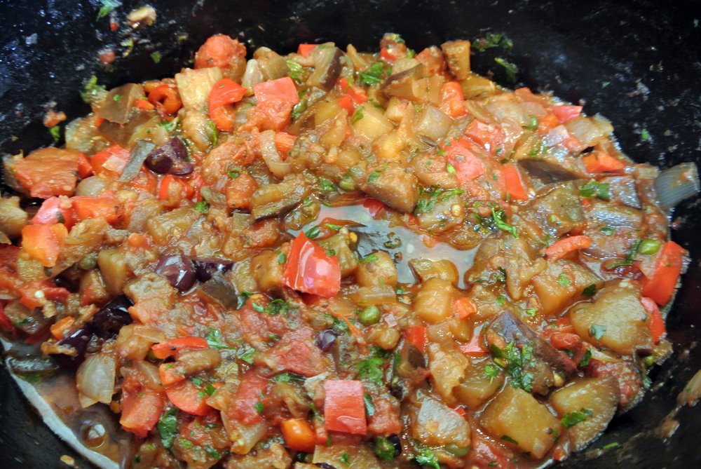 Vorbereitung: Die Auberginen waschen und in ca. 2 cm große Würfel schneiden. Den Stangensellerie waschen und in feine Scheiben schneiden. Zwiebel und Knoblauch schälen und fein würfeln. Paprika waschen, entkernen und in Würfel schneiden. Die Oliven grob hacken.