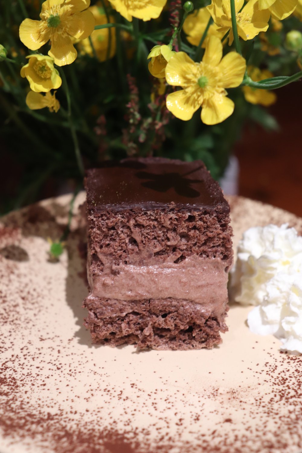 Klassische ungarische Schokoladensahneschnitten mit lockerem Kakaobiskuit und einer üppigen Mousse-Füllung. Überzogen mit einer glänzenden Schokoladenglasur sind sie ein Traum für Schokoladenliebhaber.