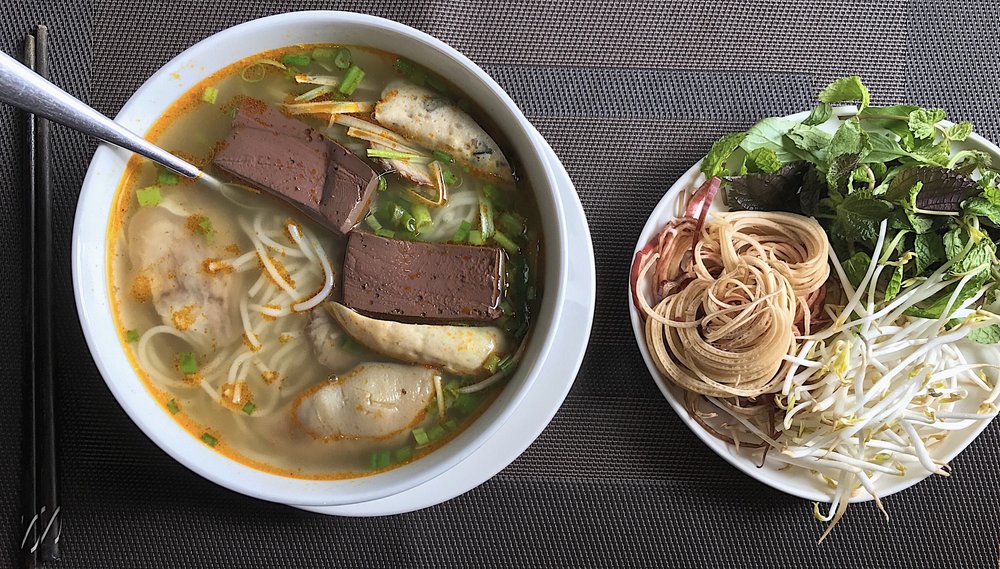 Eine würzige, aromatische Nudelsuppe aus Zentralvietnam mit dicken Reisnudeln, Rindfleisch, Schweineknochen und einer kräftigen Brühe aus Zitronengras und Garnelenpaste. Die Schärfe und Tiefe des Geschmacks machen dieses Gericht zu einem kulinarischen Erlebnis.