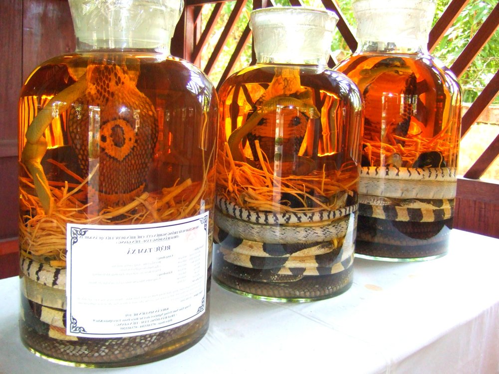Eine außergewöhnliche vietnamesische Spezialität, bei der eine ganze Schlange in hochprozentigem Reiswein mazeriert wird. Der Alkohol dient zur Konservierung und zur Neutralisierung des Schlangengifts.