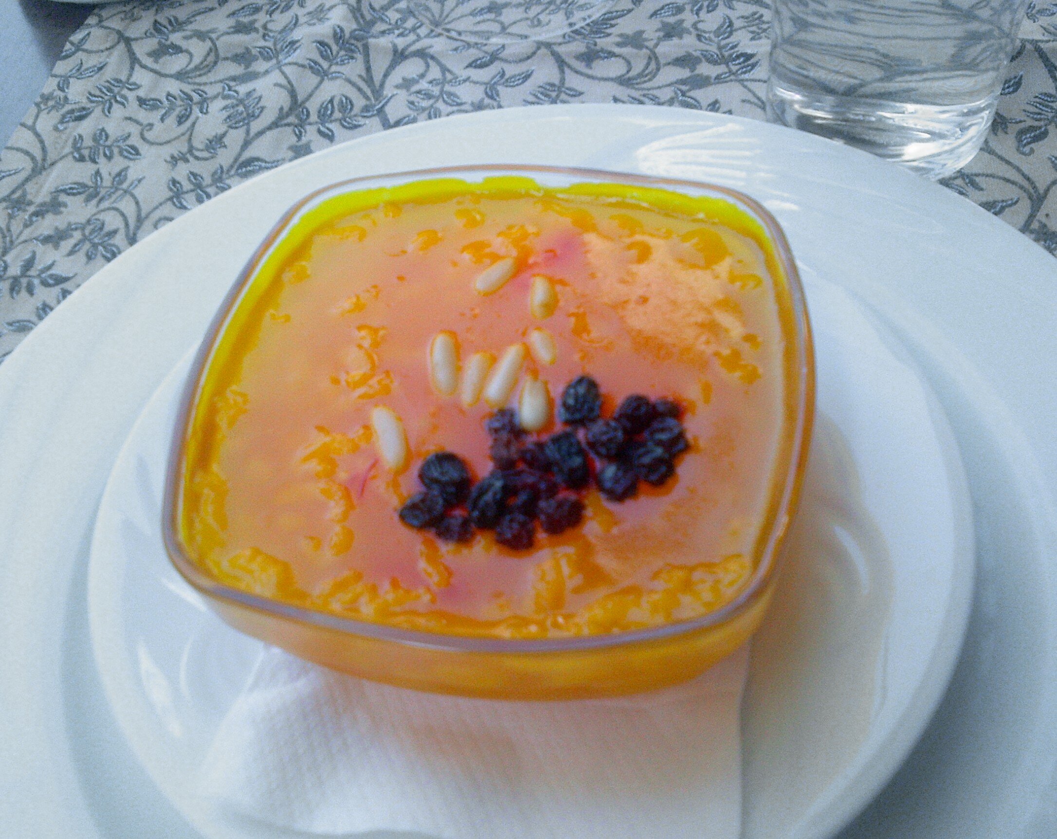 Ein festliches und leuchtend gelbes Dessert aus dem Nahen Osten. Im Gegensatz zu herkömmlichem Milchreis wird dieser aromatische Reispudding mit Wasser zubereitet. Safran, Rosenwasser und ein Topping aus Nüssen und Rosinen machen Zerde zu einem einzigartigen, veganen Genuss.